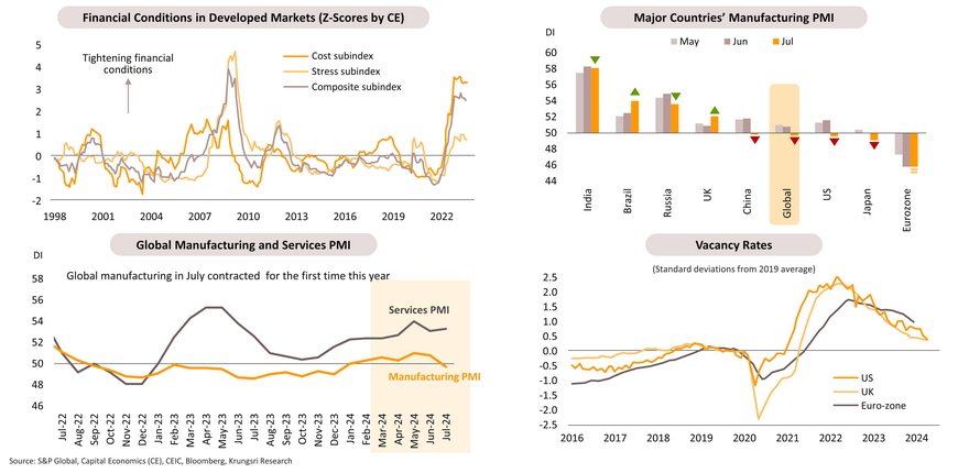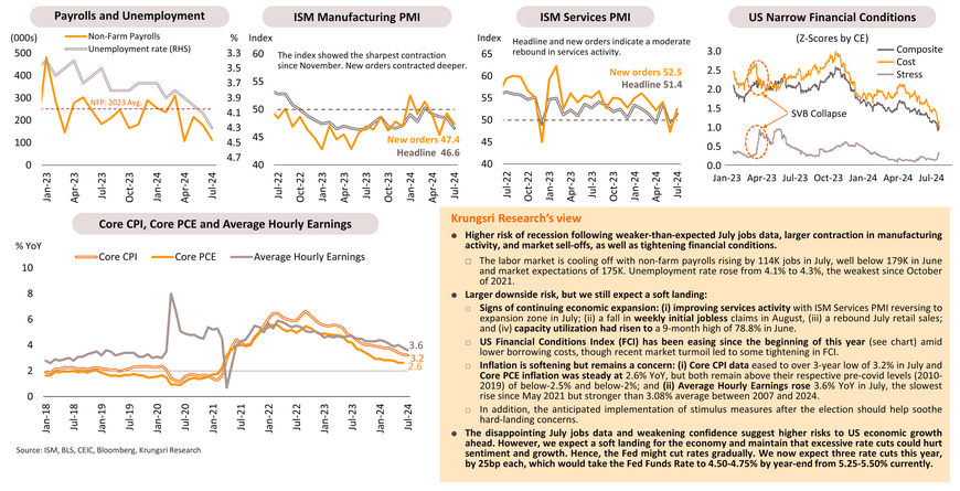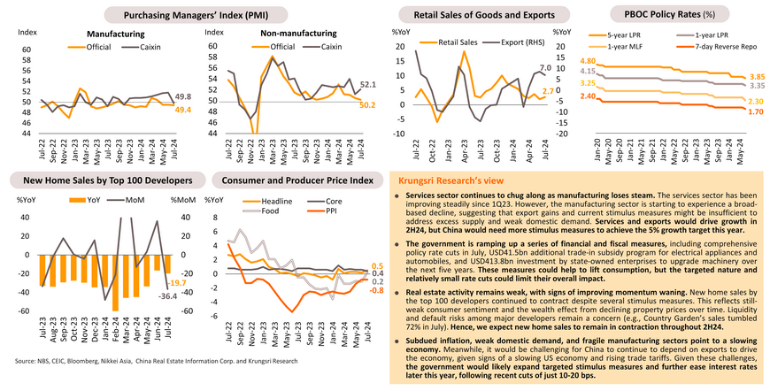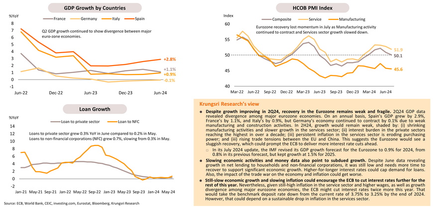 Thailand welcomed 3.1 mn foreign tourists in July, an improvement from 2.74 mn in June, driven by the extended free-visa measure and the school holiday season in neighboring markets such as China, South Korea, and Japan. In the first seven months of this year, tourist arrivals reached 20.6 mn (89% of pre-Covid level vs 71% in 2023) and generated THB 957bn receipts (90% of pre-Covid level vs 63% in 2023) led by Chinese tourists which made up the largest group; however, they are only 61% of the pre-Covid level. Tourists from Malaysia, India, South Korea, and Russia surged to 100-126% of pre-Covid levels. In August, there could be a boost from factors school holiday season in neighboring markets and summer holidays in Europe, which would keep tourist arrivals at over 3 million. We are maintaining our forecast of 35.6 million tourist arrivals in Thailand this year.