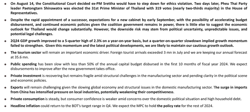 According to preliminary data from the Ministry of Finance, current and capital budget disbursements fell by -12.8% and -8.7% YoY, respectively, in July. In the first 10 months of FY2024 (October 2023 to July 2024), disbursements from the current budget reached THB2.32 trn or 84% of the annual budget, rising 2.0% YoY. For the capital budget, the government has disbursed THB0.30trn or only 41% of the annual budget, falling -22.6% YoY. Public spending has been slower than expected, especially disbursements from the capital budget which is less than 50% of the annual capital budget. This is worrying given there are only two months left in the current fiscal year. However, budget disbursement is projected to improve following the appointment of a new cabinet.