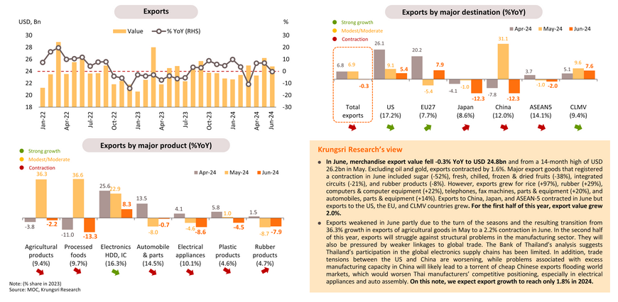 In the first half of this year, Thai exports grew 2.0% YoY led by agricultural products which grew 7.6% (including rice and rubber). Exports of industrial products (computers & parts, and plastic products) expanded by 2.0%, while exports of agro-industrial products (rubber products, tapioca products, and sugar) fell by 1.9%. Exports remained weak in many domestic industries (including cars & parts, electronic ICs, chemical products, and plastic resin), reflecting structural problems in Thailand's industrial production sector. For the rest of this year, Thailand’s exports will continue to face several challenges that could hurt growth, including: (i) structural problems in the manufacturing sector, (ii) slowing exports from major Asian countries in July, and (iii) projected slowdown in the economies of Thailand’s major trading partners, including the US and China.
