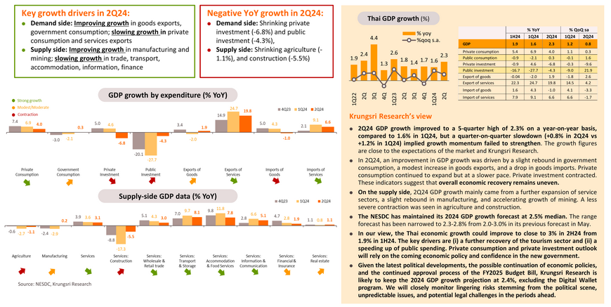 As domestic production stagnated or declined, post-COVID imports from China surged across most sectors. In some sectors, such as computers & electronics, electrical machinery, and other machinery & equipment, imports even surpassed local production. The food & beverages sector is one of the few maintaining positive trends. This sharp contrast presents two key challenges. First, the influx of cheaper Chinese goods intensified competition and might in part contributed to the closure of over 2,500 factories and nearly 66,000 job losses during 2023 to mid-2024. Second, domestic productivity might not have returned to pre-COVID levels, leaving local businesses struggling to keep pace with foreign firms. These dual challenges could threaten Thailand’s longer-term economic growth prospects.