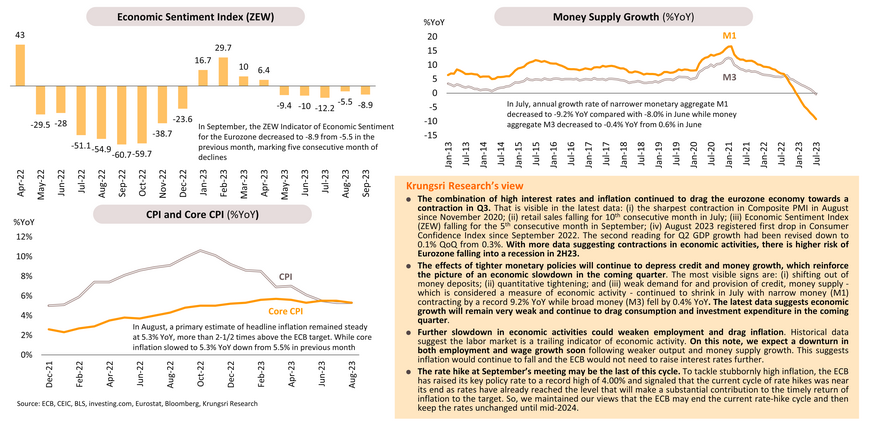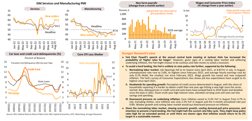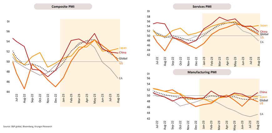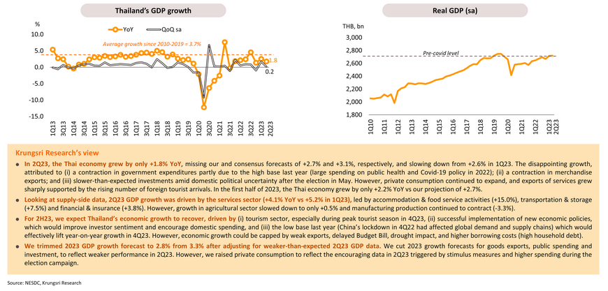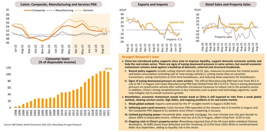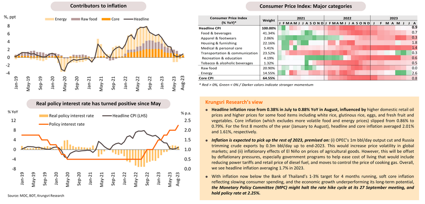 The Private Investment Index rose 1.4% YoY in July, led by investments in the construction sector. The Business Sentiment Index (BSI) dropped to an 8-month low of 48.9 in August from 49.3 in July, but the expected BSI (next 3 months) improved to 54.1 from 53.3 in July, following the formation of the new government. Furthermore, latest data by the Commerce Ministry show the total applications for registration by foreign investors had increased to THB10.02 bn in July from THB3.54 bn in June and is higher than the average of THB8.16 bn per month in the first half of this year. In the first 7 months of 2023, the number of such applications reached 377 with a total value of THB 58.95 bn. The top 5 foreign investors were from Japan, US, Singapore, China and Germany. However, investment in export-related sectors could remain weak amid the global economic slowdown.