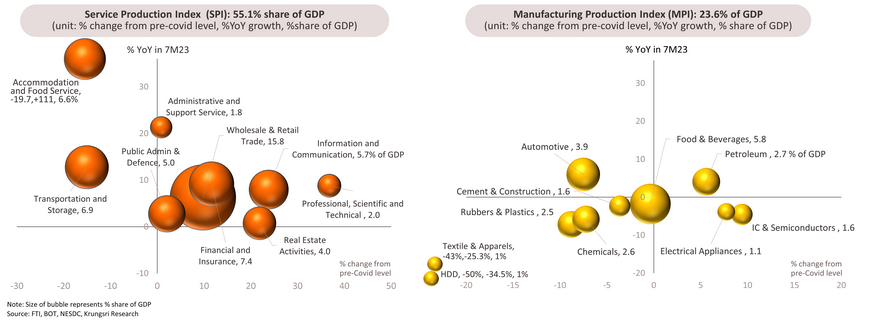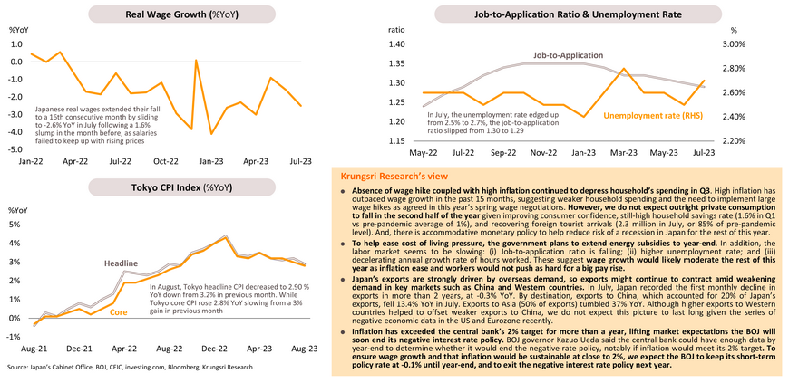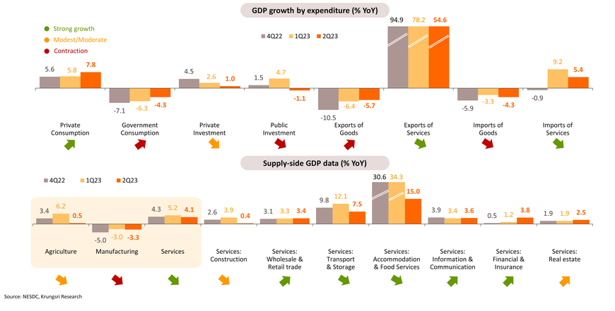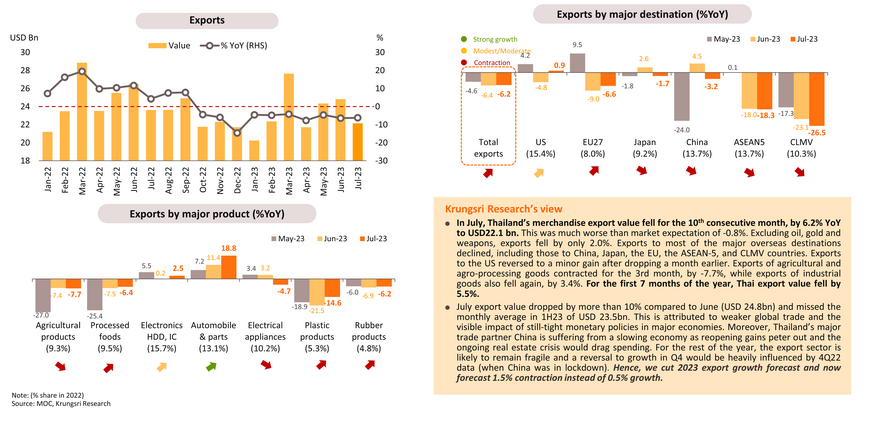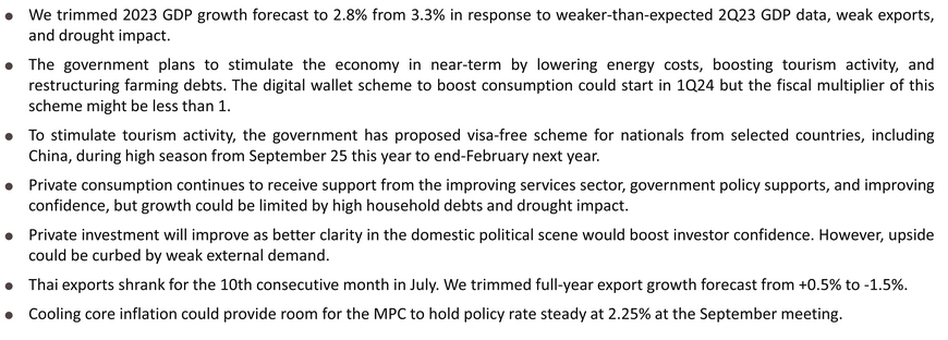 The Private Consumption Index rose 7.3% YoY in July, accelerating from +5.5% in June, driven by spending in the services category which was temporarily supported by the long holiday period. In the next period, there are positive factors including recovering consumer confidence and stimulus measures to relieve the burden of rising cost of living (such as reducing electricity cost and diesel fuel price), but private consumption would still face headwinds from high household debt, elevated borrowing costs, and the drought hurting farming income.