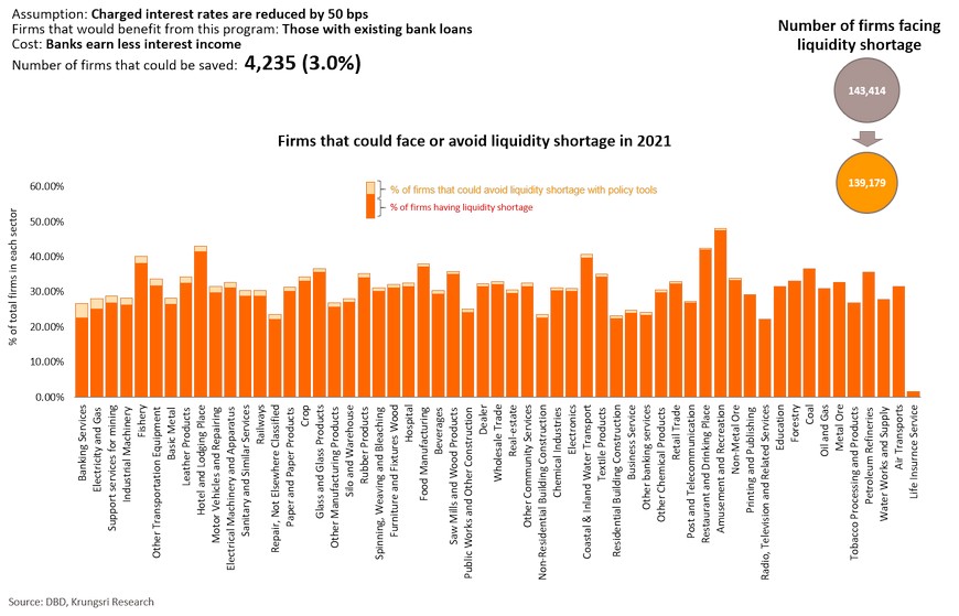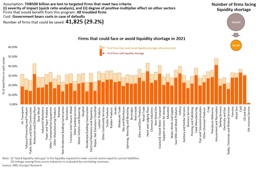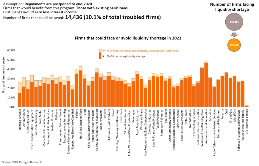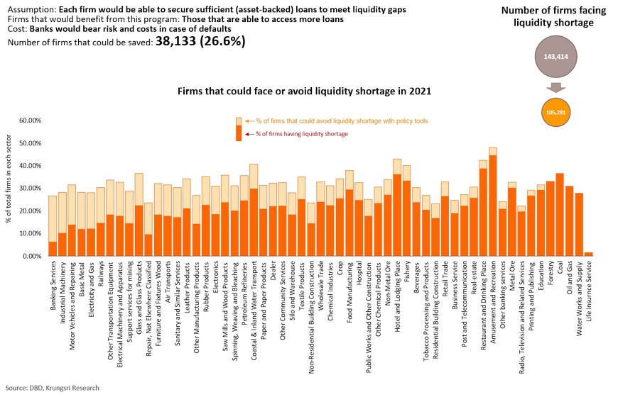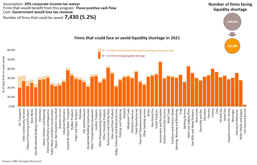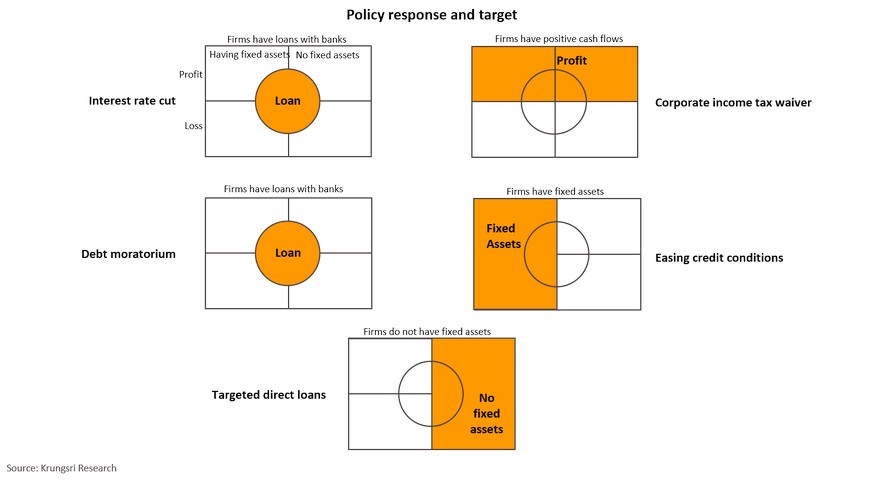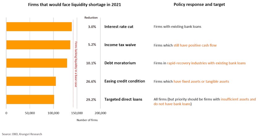 The European Commission and Federal Reserve believe the Spanish Influenza had short- and long-term impact on the economy. At that time, income fell by 6-9% and reduced potential economic growth by 0.6ppt. Today, of the 48.3 trillion baht worth of assets held by Thai firms, 28.7% (or 6.9 trillion baht) are held by firms facing financial distress, and another 22.8% is held by those identified as at-risk. These assets could become under-utilized soon if business activity drop. They would lay off employees, which would likely lead to permanent unemployment. This would hurt demand in the near-term and reduce labor productivity in the longer-term. Krungsri Research estimates business closures, under-utilized assets and lower labor productivity would shave 0.5 ppt of Thailand’s potential growth trajectory. There is a need to keep businesses afloat to prevent economic growth from sliding further in the long run. To assess the positive impact of policy responses, we simulated scenarios under five policy tools: interest rate cut, corporate income tax waiver, debt moratorium, easing credit conditions, and targeted direct loans to firms.