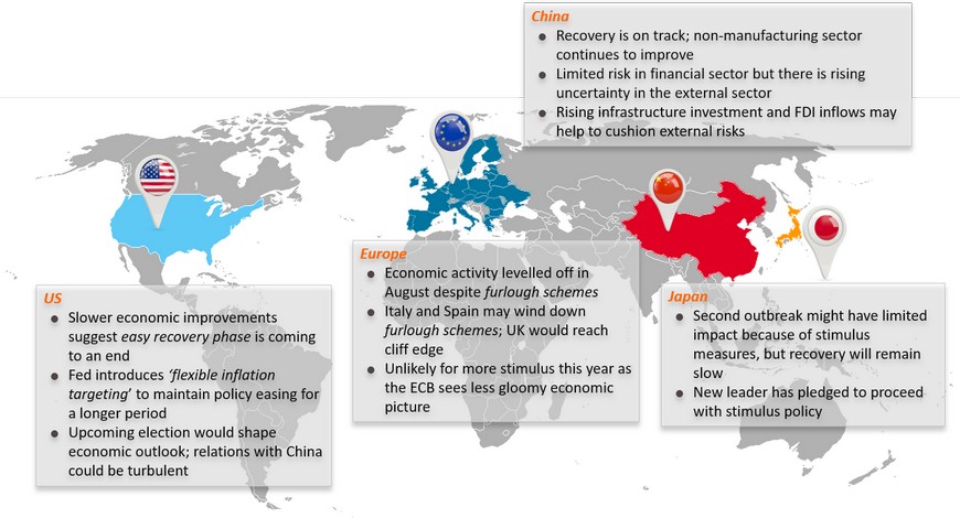 The European Commission has proposed to European Council to approve loans under the ‘SURE’ program which aims to support business and ‘short-time’ workers in 15 member states. Italy would receive the largest allocation of EUR27.4bn, but that would be smaller than its current employment support program. The government in each member state would also attempt to support the furlough scheme. Germany would keep the Kurzarbeit program until end-2021. Spain would receive EUR21.3bn allocation from the ‘SURE’ program, similar to the size of its current measures. However, the employment support measure in Spain would be reduced to cover only the hardest-hit sectors and the subsidy would be cut from 70% of prior earnings to 50% in the following months. This has created uncertainty over the outlook for Spain’s labor market. The UK government will not extend its program after 31 October, which could push the country to the cliff’s edge. Unemployment rate is expected to spike from 3.9% in July 2020 to a high of 8.5% by April 2021.