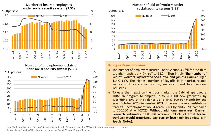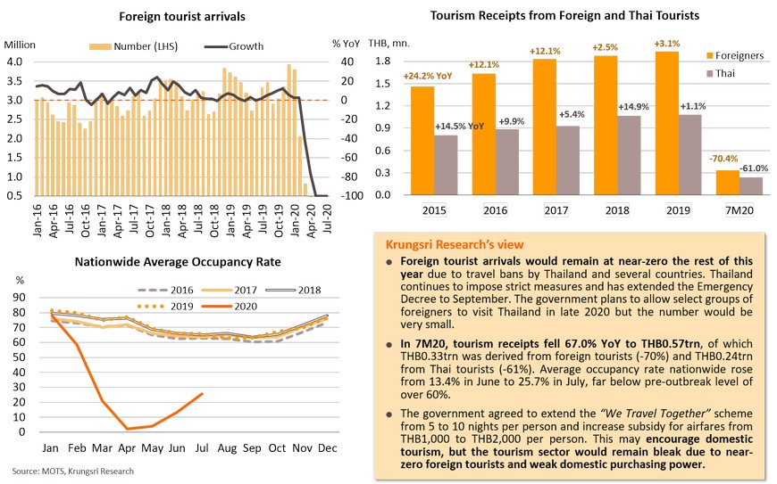 Thai exports continued to drop, but by a smaller magnitude. Plunging imports reflect weak demand and weak export outlook. Foreign tourist arrivals will remain near-zero the rest of this year. COVID-19 crisis could affect one-third of total formal workers.