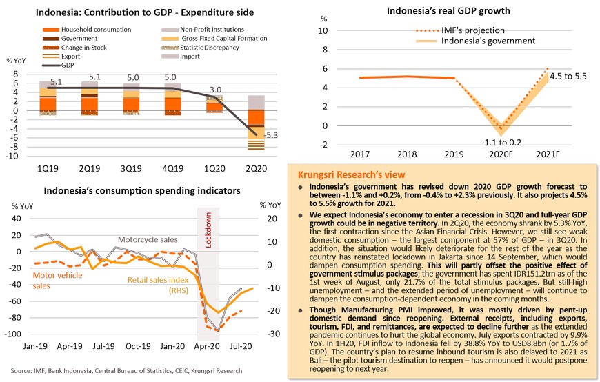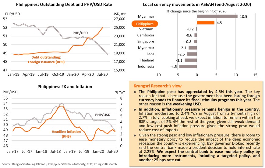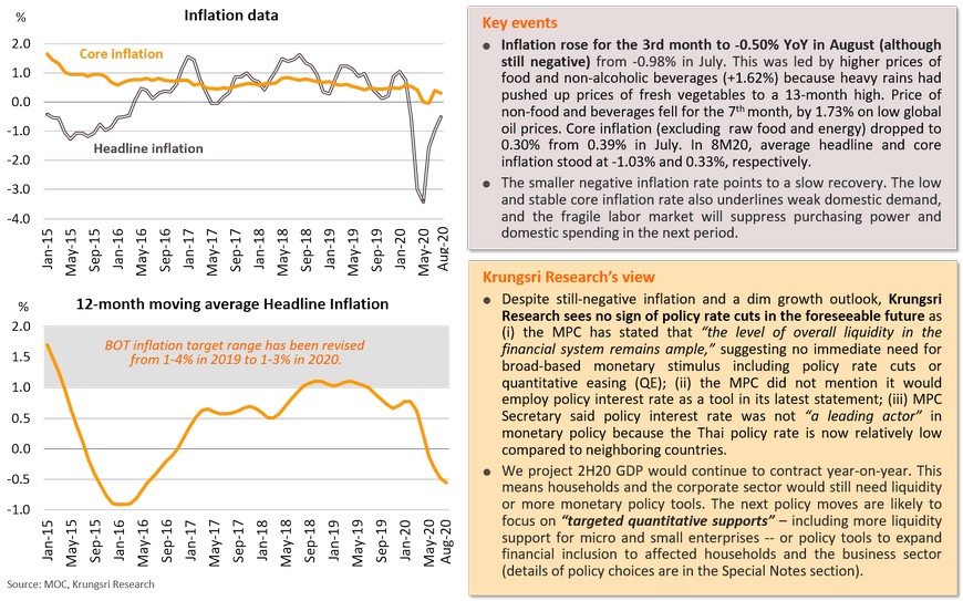 The second wave of infections might have limited impact on the Japanese economy, reflected in improving PMI readings and other indicators. In August, Jibun Manufacturing PMI rose to 47.2, the highest reading since February. Services PMI only edged down from 45.4 to 45.0. Public transportation and driving activities have exceeded pre-COVID levels. The stimulus programs could help to cushion risks from the second wave. One of Japan’s key stimulus measures is the “Go to Travel” program which ran from July 22nd to end-August. Domestic travel spending by Japan residents was twice greater than overseas travel expenditure. 7.8 million people took advantage of the “Go To Travel” campaign. The government will launch the “Go to Eat” campaign in September, which would offer (i) discount vouchers of up to 25% valid until end-March 2021, and (ii) point-based rewards which offer up to JPY500-1,000 for online reservations. There was also improvement in the labor market; the number of regular employees continued to increase in July, rising for the third consecutive month. Average monthly wage also rose, which would improve purchasing power in the next period. On external demand, exports remained weak in July (-18% YoY), but it is a smaller contraction for the second straight month. Despite weak external demand, the improving labor market and support from domestic stimulus measures are expected to help the Japanese economy to remain on its slow recovery path.