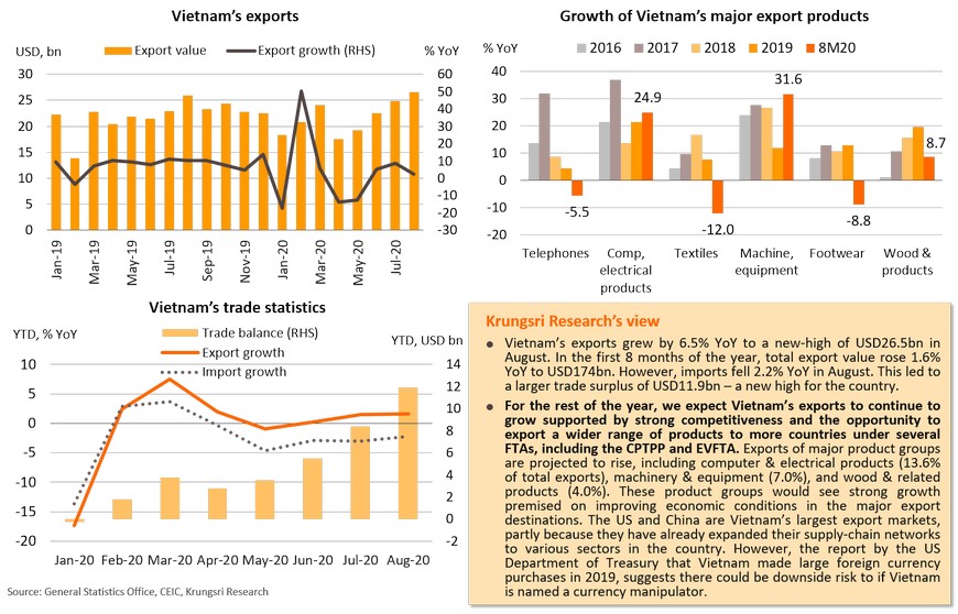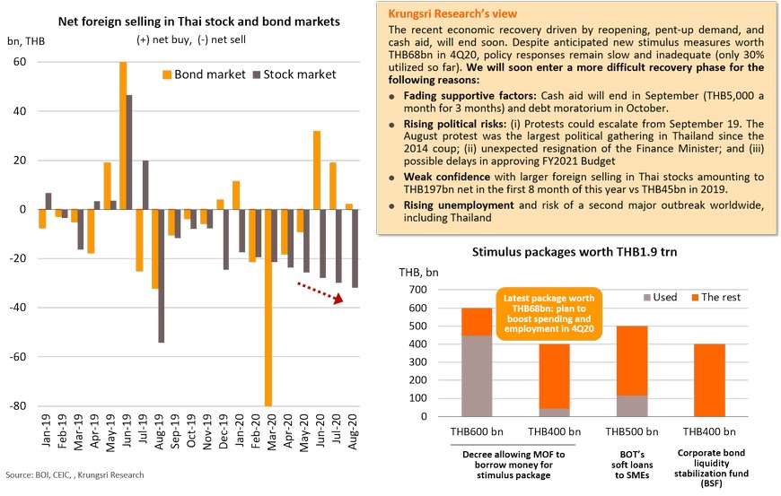 There have been signs of a recovery in economic activity in major countries, raising hopes for a rebound in international trade. Imports by the US, the EU, Japan, and China account for almost 60% of world imports. Vietnam would be the largest beneficiary of recovering US imports. Stronger imports in the EU and Japan should benefit China. Recovering Chinese imports could benefit Japan. Thailand would see relatively small gains from recovering imports in major countries, including Japan. However, Japan’s imports remain weak (-21.2% YoY in July). The recovery in EU imports would not benefit Thailand. This implies Thai exports would recover slower than other Asian countries, such as Vietnam, Singapore and Malaysia.