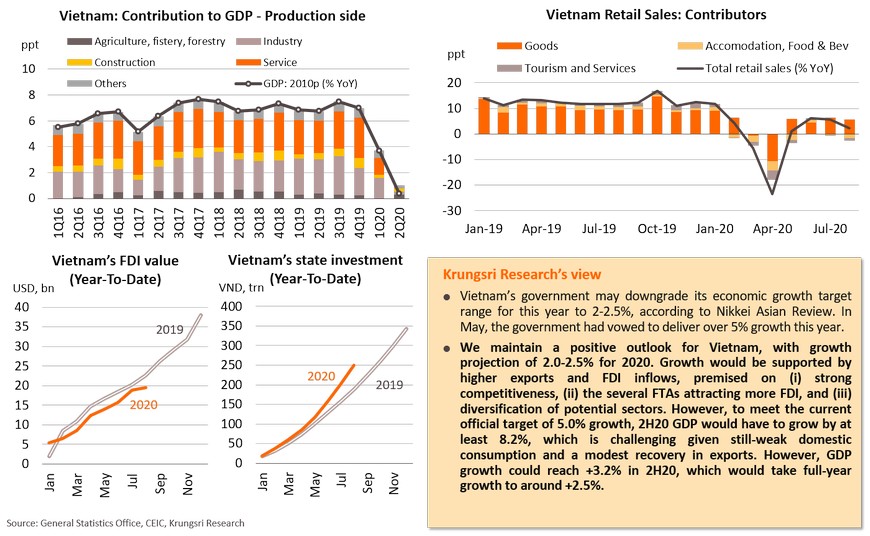 China’s economic recovery could encounter some bumps ahead. In 1H20, the four big banks reported net income had dropped from past year and profits had contracted by 10-12% YoY. Nonetheless, Fitch is keeping its “stable” assessment for the Chinese banking sector because the PBOC has cut interest rates and is helping debtors by deferring loan repayment, which would reduce Chinese banks’ exposure to financial risks. Meanwhile, 1-year interest rate swaps have climbed to a 7-month high; this indicates rising stress, but it is still below pre-COVID level. On the external front, exports jumped 9.5% YoY in August, marking an improvement from July and the 3rd month of increase. However, there is rising uncertainty because the US presidential candidates could escalate tension. The extended conflict is a major threat to China’s economy. Based on Bloomberg estimates, potential growth is expected to fall to 3.5% by 2030 if the decoupling blocks the inflow of investment and technology transfer from the US to China, compared to 4.5% growth in the base case scenario. The situation would worsen if the allied countries join the US in decoupling from the Chinese economy; China’s potential growth would drop sharply to 1.6% by 2030.