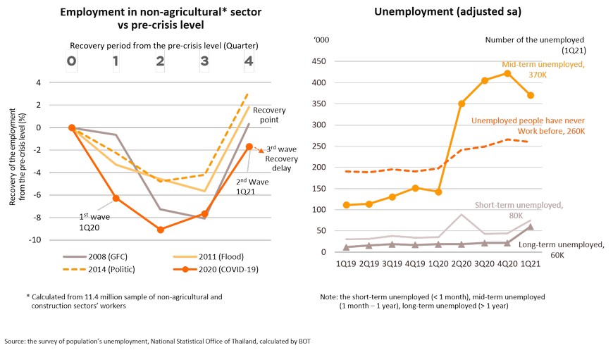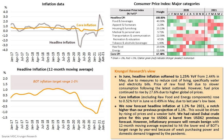 Although Private Investment Index (PII) slipped 2.3% MoM sa in May, the index registered double-digit growth on year-on-year basis for the 2nd consecutive month, boosted by stronger export growth. The PII also has been rising since late 2020 and exceeded pre-pandemic level. The survey which was conducted before daily cases surged, revealed Business Sentiment Index picked up in June. We will maintain our private investment growth forecast for 2021 at 3.9% vs -8.4% in 2020, as a windfall from promising exports could be offset by weaker domestic demand. On household spending, Private Consumption Index (PCI) fell for the 2nd month in May (-3.1% MoM sa or +0.5% YoY), with declines in all categories attributed to the latest wave. The Consumer Confidence Index also continued to drop to a record low in June. Given a possible rise in unemployment, lower income, and limited stimulus measures, we revised down private consumption growth forecast for this year to +1.1% from +1.8% in the previous forecast.
