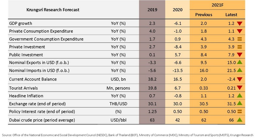 We cut 2021F GDP growth for the fourth time by 0.8 ppt to +1.2% to reflect Thailand’s worst COVID-19 outbreak and limited policy supports; promising exports could reduce some of the pain.