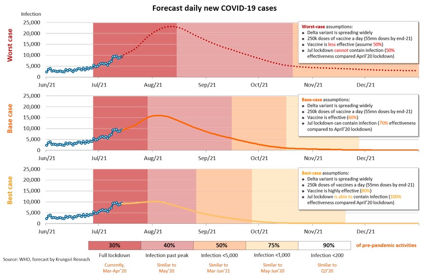 The worst-case scenario in our previous forecast is now our baseline scenario as new cases have risen to nearly 10,000 per day since early July. More importantly, it is dominated by the Delta variant and is spreading to several provinces. Our latest forecast assumes new cases in Thailand would be attributed to the Delta and Beta variants in the coming months, so we analyzed historical data for Thailand, India, South Africa, and the UK. The July lockdown in Thailand is assumed to be 70% as effective as the lockdown in April 2020, suggesting new cases would increase to 15,000/day by early-August. Thailand is expected to dispense 250,000 doses of vaccine per day the rest of this year, taking total vaccines dispensed to 55m doses by year-end. This could help to bring down daily new cases, especially after September. Vaccine efficacy remains key to driving down daily cases (assuming 60% vaccine efficacy). In our latest base case scenario, we expect the number of new cases to drop below 1,000/day by November this year. In the worst case, where the vaccines are less effective and July lockdown cannot contain the outbreaks, daily new cases could exceed 20,000 and the lockdown would last longer.