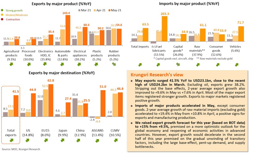 Thai exports are gaining momentum. May export value (USD23.1bn) is close to the recent high recorded in March and well above the last 5-years’ May average of USD19.47bn. Out of Thailand’s top 20 export products (64.8% of total exports), export values for 17 products (60.4% of total exports) have exceeded pre-COVID levels, led by fresh, frozen & dried fruit, tapioca products, air conditioners, chemical products, and rubber. If export values of more products improving (i.e. more broad-based improvement), that would support domestic manufacturing production and private investment ahead.