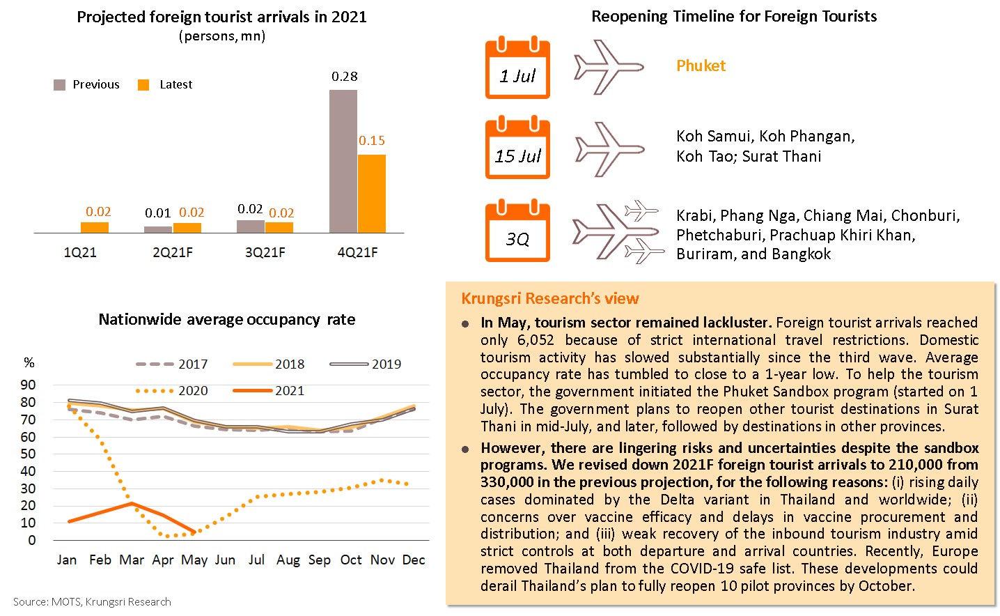 The latest COVID-19 situation in Thailand could dampen domestic demand. However, Manufacturing Production Index was steady in May and remained above pre-pandemic level for the 3rd straight month supported by stronger exports as trading partners’ economies recover. The improving index was led by the electronics, automotive, electrical appliances, and rubber & plastics industries. Capacity Utilization rate (sa) was steady at 65.2 in May, higher than at end-2019 (pre-pandemic level). For the second half of 2021, Krungsri Research expects the strong exports to mitigate the latest COVID-19 impact on manufacturing production.