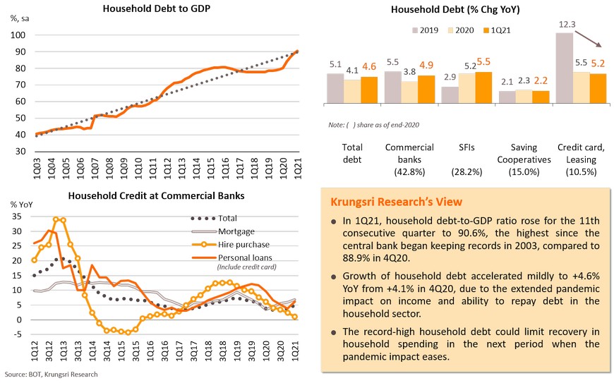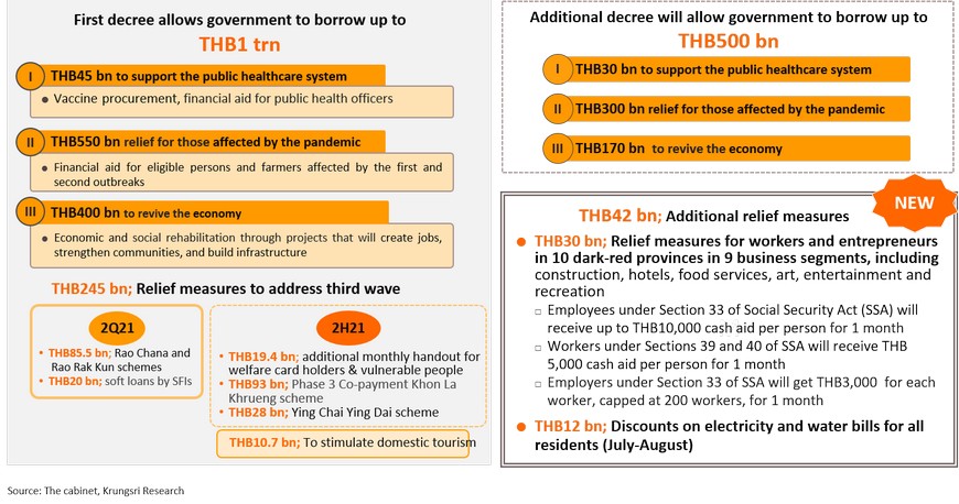 We expect the BOT to keep policy rate at a record low this and next year. Even though the global economic recovery is gaining momentum and several central banks have signaled they would unwind massive monetary stimulus sooner than expected, Thailand is in no hurry to raise policy rate. This is because the recovery in Thailand remains weak and the nation could take longer to see a broad-based recovery. In addition, the BOT recently indicated there was downside risk to its GDP growth forecast because of the longer-than-expected outbreak. Hence, Thailand is likely to employ a very-accommodative policy this year and next year to nurture a sustainable economic recovery. Looking at debt relief measures, as of 12 July, the BOT has approved THB72.4bn in financial aid for up to 23,687 borrowers, averaging THB3.1mn credit line per borrower. Around 47% of borrowers are SMEs involving THB50mn in existing loans, and 48% are in the commerce sector. Under the Asset Warehousing program, only THB0.9bn has been approved for 2 borrowers/hoteliers. Indeed, this financial assistance was designed before domestic cases started to surge, suggesting Thailand needs more targeted monetary stimulus to improve liquidity in affected groups and to prevent permanent economic scars.