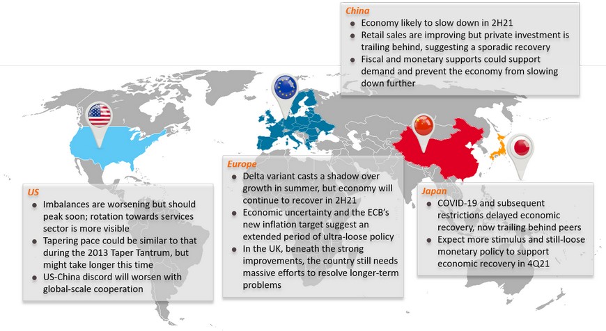 The June FOMC meeting suggested the Fed might raise rates faster-than-expected, possibly to 0.6% in 2023, according to median projections. The Fed has already observed good economic progress and could meet their criteria for ‘substantial progress’ by the end of the year. Inflation has surged after reopening and inflation expectations remain above the Fed’s target. The Fed acknowledges inflation pressures are stronger and more persistent than anticipated. Moreover, financial conditions have eased since November last year. This suggests the central bank has achieved its objective of injecting liquidity. Amid the plentiful job openings, if the US can add about 600k jobs per month in 2H, that would bring unemployed workers to below 2 million (near pre-pandemic level) by year end, assuming a smaller labor force due to retirement and voluntary unemployment. We maintain that the Fed would announce tapering in 4Q21. Based on past trends, the Fed would taper gradually starting with reducing monthly purchases of Treasury and MBS by USD5–10bn each in the first year after the announcement. Subsequently, they would drop purchases to zero for few years before deciding to sell these assets. The tapering this time would be similar that during the 2013 Taper Tantrum, but the larger purchase volume during the pandemic suggest it would take about 2 years to taper down to near-zero.
