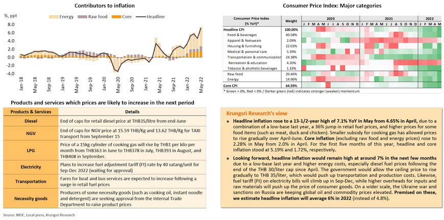 Farm income has increased sharply following a jump in farm prices and farm output. Excess saving has surged from THB1,060bn at end-2021 to THB1,349 bn at end-April, accounting for almost 8.2% of GDP (vs 6.5% at end-2021). Although unemployment rate improved to 1.53% in 1Q22 from 1.6% in 4Q21, it is still higher than pre-Covid level of 1% in 2019. In addition, quasi-unemployment remains high at 3.78 million as several businesses have reduce work hours instead of employment. Household debt also rose to above 90% of GDP, which could limit consumer spending growth.