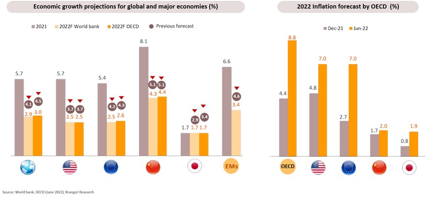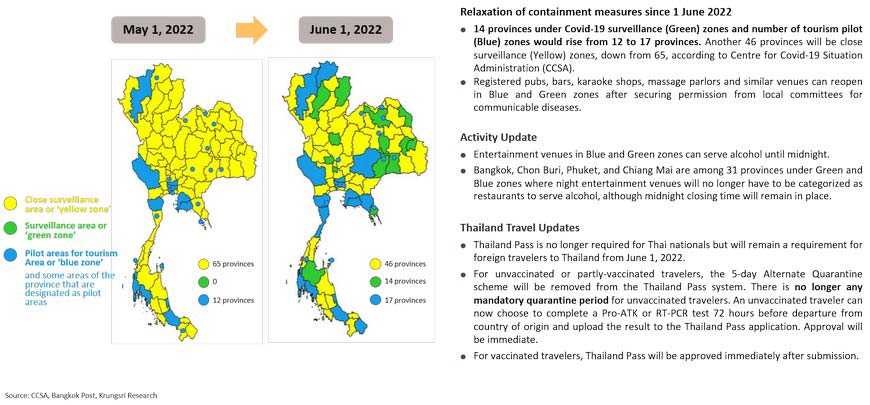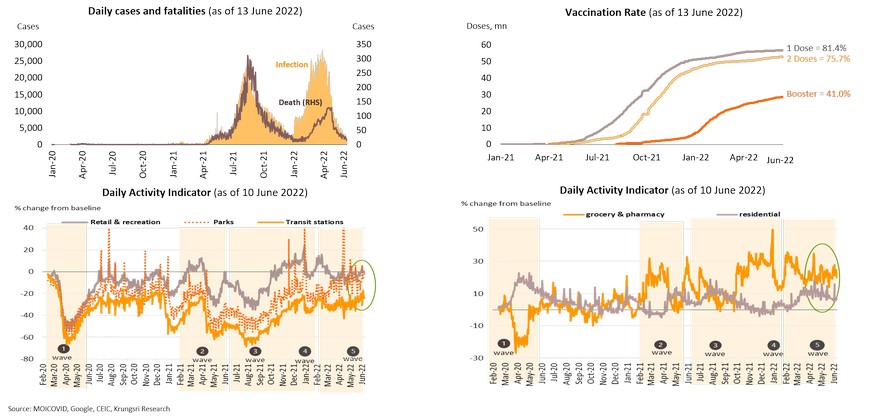 Since cancelling the Test & Go program on May 1, Thailand has received more than 500,000 foreign tourists or a daily average of 20,000, greater than 10,000 foreign tourist arrivals in April. Therefore, foreign tourist arrivals in the first 5 months of 2022 reached 1.35 mn. There were more tourists from the UK, Germany and Russia in January-April this year. Looking ahead, the tourism sector is showing more positive signs since the government relaxed travel restrictions and allowed quarantine-free entry to visitors from June 1. Registrations for Thailand Pass with health insurance (USD10,000) for foreign tourists may be canceled from July. These are expected to simplify regulations for foreign tourists. The Tourism Authority of Thailand expects foreign tourist arrivals to reach 500,000 monthly in 3Q22 and peak at 1 mn per month during high season in 4Q. For the whole year, Thailand expects to receive 7-10 mn foreign tourists and generate THB1.5 trn in tourism receipts. Krungsri Research views foreign tourist arrivals could surpass our forecast of 5.5 mn for this year.
