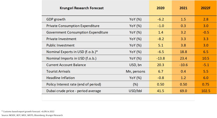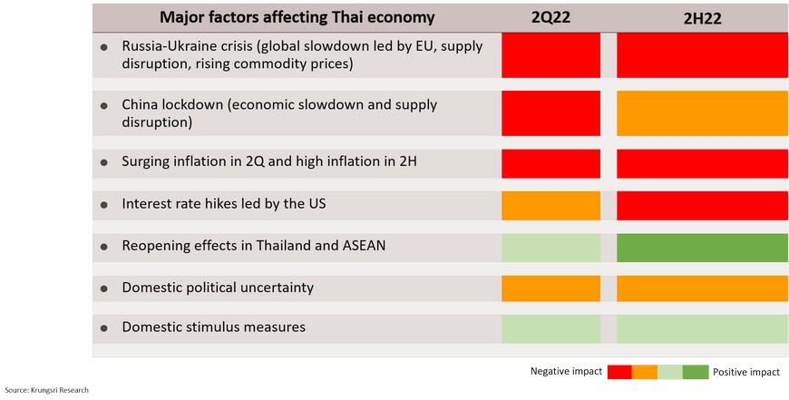 Business sentiment has been volatile this year due to several uncertainties, including the Ukraine crisis, China lockdowns, worsening supply disruption, as well as surging domestic inflation which has dampened purchasing power. In the longer term, investment will be driven by push inward FDI. In 1Q22, foreign direct investment rose 29.1% YoY, following 169% growth in 2021. Looking at FDI applications by category, the top three sectors in 2021 and 1Q22 industries that benefited from industrial transformation and reopening. In addition, sales and rental income in the industrial estate sector should improve by 31.7% in 1H22, especially those in the EEC area which remains a prime location. The value of applications for projects in the EEC area rose by 11.7% in 1Q22. Specifically, there was a surge in applications for projects in next-generation vehicles (mostly EV) and biotechnology to support a environment-friendly economy and health-conscious society. Expansion in the healthcare sector and transformation to a green economy would continue to encourage more investments in the long run.