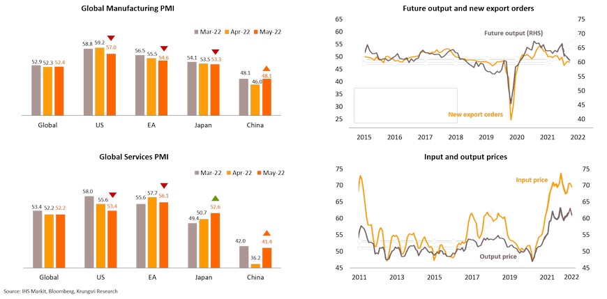 We expect exports to remain under pressure for the rest of 2022 premised on softer global demand for manufactured goods, lingering supply disruption, and a slower global economy. Thai export growth could slow down from +13.7% average in the first four months of this year. We expect 2022 export value to grow by 6% based on MOC data (or 6.5% based on BOT data). The World Trade Organization (WTO) has trimmed its forecast for merchandise trade volume growth for 2022 to 3.0% from 4.7%, due to uncertainty over how Ukraine conflict will pan out. There have been recent signs of decelerating manufacturing output in core countries as a result of the global economic slowdown and supply disruption.