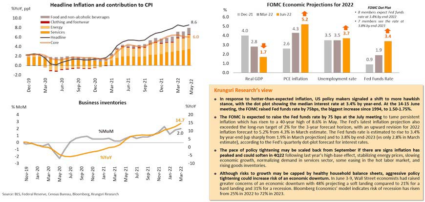 Economic growth is slowing but remains well above recession levels. While ISM Manufacturing and Services PMI data showed signs of stabilizing, they remain above-50. New orders sub-indices also reflect strong domestic demand. A running estimate of real GDP growth and components based on available economic data for the current measured quarter, called Nowcast, show that real GDP growth (seasonally adjusted annual rate) in 2Q22 might only reach 0.9% (data as of June 8) but Personal Consumption Expenditure in the same quarter could grow by 3.7%, stronger than pre-Covid level. Despite some easing in the hot labor market, job openings remain close to a record high in April and hourly earnings growth is high at 5.2% YoY in May, well beyond pre-Covid level. Non-farm payrolls are also better than market expectations, by 390,000 in May. Consumers have continued to spend as personal savings rate drop to a 14-year low of 4.4% in April. The tight labor market, high wage growth, and lower savings rate are boosting consumer spending, which could contribute to rising demand-pull inflationary pressure.
