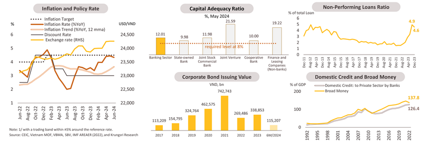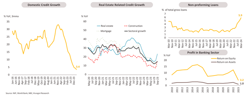 The banking sector is expected to be relatively resilient in 2024. Non-performing loans (NPLs), albeit remained high, are likely to decrease as borrowers' debt repayment capabilities improve, supported by stronger domestic activities, easy monetary conditions, and extended forbearance measures until the end of 2024. In addition, the Land Law is expected to lower the spillover risk of the bond market on the banking sector by alleviating difficulties faced by real estate developers such as streamlining legal procedures, improving land valuation, and enabling independent site clearance. The amended law will likely increase liquidity in the real estate sector and enable highly bond-leveraged developers to continue their projects, thereby enhancing their ability to repay debt and redeem bonds.