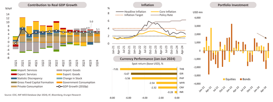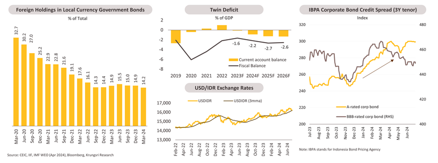 On the monetary policy front, a surprise April rate hike was likely a one-off, aimed at mitigating negative impacts from external conditions due to outflows of bonds and equities and poor IDR performance compared to peers. The watchpoint for BI to cut rates later this year depends on the US rates outlook and other factors that affect global financial conditions, including geopolitical factors and the US election outcome. We still expect BI to cut rates late this year due to elevated real interest rates, but the extent of the cut can be more conservative than previously expected.
