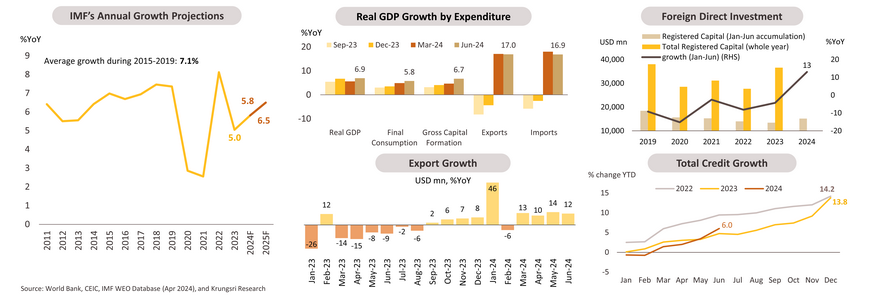 Thanks to global electronics upturn and pick-up in external demand, particularly from the US, exports surged by 17% in 1H24, supported by key sectors like electronics and textiles. Improved exports have led to expansion in industrial production and enhanced business sentiment. Resilient private consumption and investment are reflected in the accelerated credit growth.