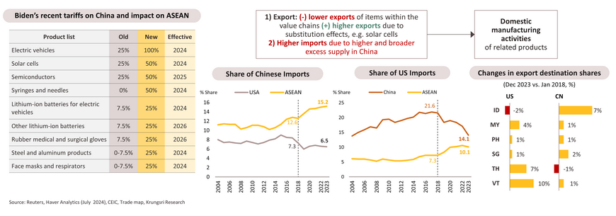 The impact of the latest tariff hikes on ASEAN is transmitted via China’s supply chains, affecting both exports and imports and will eventually affect domestic manufacturing activities. Indirect effects via Chinese supply chains could reduce ASEAN exports to China. However, the substitution effect could increase ASEAN exports to the US. There is also a possible increase in imports from China to ASEAN due to an excess supply of related products. This possibility has already led to further trade protectionism between China and other countries, with Indonesia recently considering tariff hikes of up to 200% on Chinese products to protect local small- and medium-sized businesses.