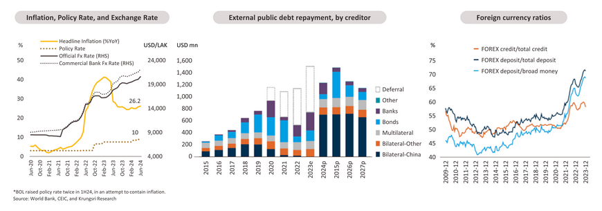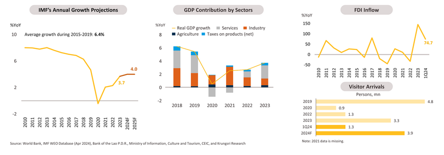 Laos’ economy is expected to gradually recover due to external drivers, with growth projected at 4% in 2024. These drivers include improved performance in services exports like tourism, logistics, and transport. In addition, foreign investment has increased significantly, mainly in the electricity and mining sectors.