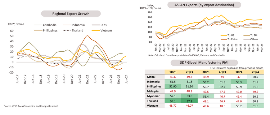 In 1H24, ASEAN exports showed a gradual bottoming, led by Vietnam and Cambodia with both garments and non-garments (particularly electronics) showing recovery. Despite a pullback in exports to EU since early 2023 and to China in 2024, resilient exports to the US have been observed. Improving manufactured goods exports have had a positive spillover effect on private investment, as reflected by the improvement of manufacturing PMI across ASEAN, particularly in Vietnam. However, domestic-demand-oriented economies like Indonesia and the Philippines have also maintained manufacturing PMI in the expansion zone, largely attributed to resilient domestic demand.