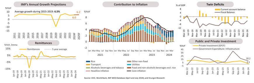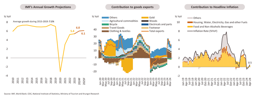 The economy is steadily recovering, with growth projected at 6% in 2024, driven by a rebound in the tourism sector and strong performance in both garment and non-garment exports. In the first quarter, international tourist arrivals reached 85% of 2019 levels. Since late 2023, declines in garment-related exports have lessened, and increases in other exports— notably solar panels, electrical parts, and primary products—have contributed to the recovery of goods exports. Improved tourism and goods exports are expected to support economic momentum.