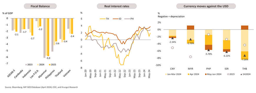 In terms of monetary policy, during the first half of 2024, ASEAN Central banks have maintained their policy rates, except for Indonesia and Lao PDR, which hiked their respective policy rates to stabilize local currency against the US dollar and to curb inflationary pressures, respectively. All regional currencies weakened against the US dollar following the Fed's decision to delay rate cuts. This change in monetary policy expectations, combined with ongoing geopolitical tensions, has led to increased volatility in capital flows and exchange rates throughout the ASEAN region.