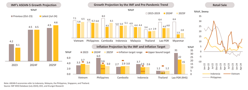 In line with the previous report, ASEAN growth is expected to accelerate from 4.1% in 2023 to 4.5% in 2024. In the first half of 2024, most ASEAN countries depicted a similar perspective of goods exports picking up, though varied economic fundamentals in each country have resulted in different export recovery pictures and impacts on growth. Among ASEAN countries, export-oriented economies like Vietnam and Cambodia have benefited the most in this regard. Domestic demand remains a key growth driver, driven by easing inflation and robust labor markets, although it has been somewhat constrained by high real interest rates. Rising exports have helped offset the impact of these higher rates on growth.
