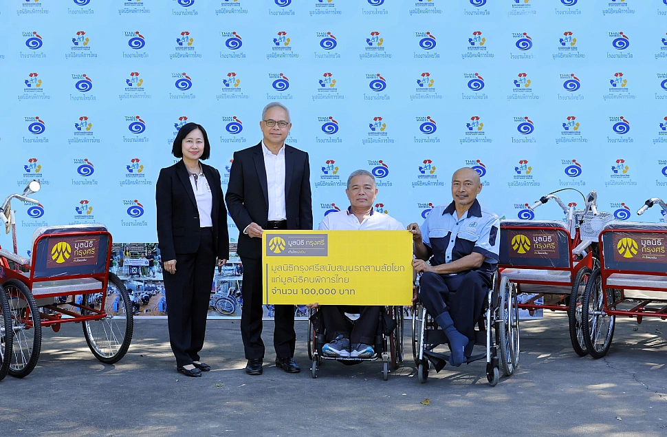 Bangkok (24 December 2025) – Mr. Pairote Cheunkrut (2nd from left), Chief Strategy Officer of Bank of Ayudhya Public Company Limited, represented Krungsri Foundation in presenting a donation of 100,000 baht to the Thai with Disability Foundation. The funds, which were received by Mr. Kittipong Hadtawaikarn (2nd from right), Director and Treasurer of the Thai with Disability Foundation, will be used to make hand-operated tricycles for elderly people and disabled people under the foundation’s mobility assistance project.