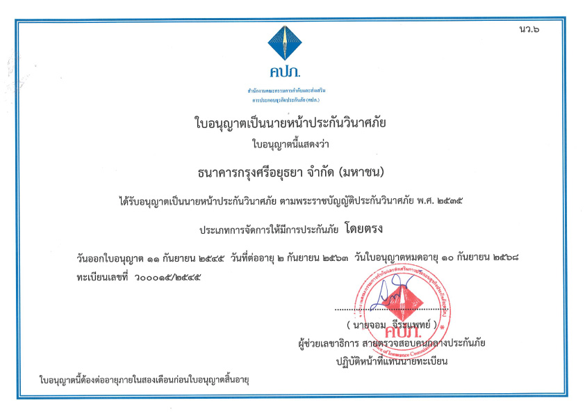 Bank of Ayudhya Public Company Limited is a non-life insurance broker under the Office of Insurance Comission with license number ว00015/2545