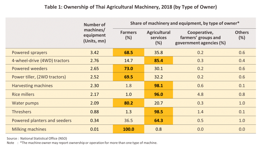 SMEs: These businesses have often developed from companies that began by repairing engines and machinery, and most operate a business model based on using ready-made parts and engines (sourced either overseas or domestically) for adaption or assembly in Thailand. This allows players to offer machinery that is adapted to local conditions and the needs of farmers in the immediate environment. Marketing efforts are thus somewhat limited and these tend to be restricted to the local area only, but the result of this is then that nationally, there are many such players spread across the different regions of the country. These typically rely on low- to middle-end technology, and manufacturing output tends to be concentrated on power tillers, other types of tillage equipment, regular and axial pumps, sprays, rice threshers, combine harvesters, farm trucks, dryers, and small rice mills.