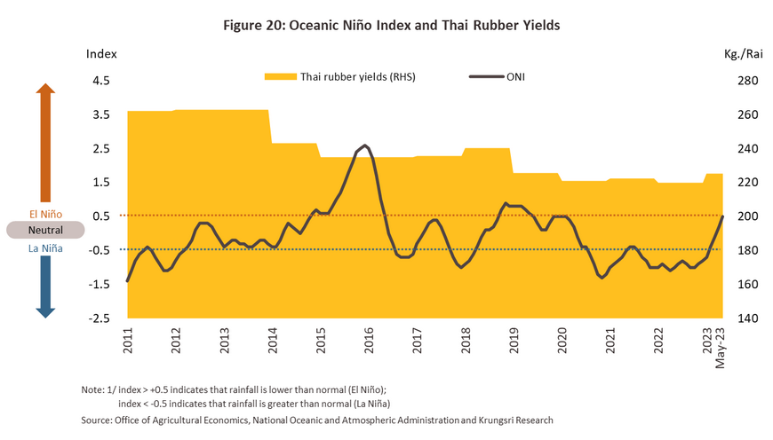 Output by the Thai rubber industry will move in line with the general trend in growth in the global industry, which is forecast to expand by an average of some 1.5-2.5% annually. Thai production will move somewhat ahead of this, and so growth is expected to average 2.5-3.5% per year20/ on: (i) the expansion in the area under cultivation that took place over 2003-201321/ and the extension of the growing area into the north and northeast in 2015, with plantations in these areas now entering the period of highest outputs22/ ; (ii) the coming El Niño, which is forecast to affect the weather for the next 1-2 years, decreasing rainfall in the south of the country23/ and thus increasing annual outputs by an average of 0.5-1.5% (Figure 20); and (iii) high prices for rubber over 2018-2021 that have incentivized growers to look after their stands and to maximize outputs. Nevertheless, growth will come under threat from the risk of outbreaks of disease, especially of both old and new strains of leaf drop disease24/. In addition, when rubber prices were low, some growers switched to planting more profitable agroforestry products (e.g., durian and oil palm) or raising livestock (e.g., cattle and goats).