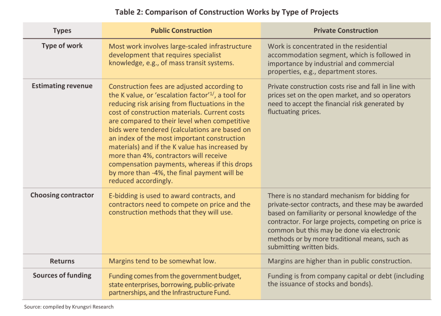 งานก่อสร้างภาคเอกชน: ส่วนใหญ่เป็นงานก่อสร้างที่อยู่อาศัย คิดเป็นสัดส่วน 52% ของมูลค่าก่อสร้างภาคเอกชนทั้งหมด ที่เหลือเป็นงานก่อสร้างโรงงานอุตสาหกรรม และอาคารพาณิชยกรรม เช่น ศูนย์การค้า โรงแรม และโรงพยาบาล เป็นต้น ทิศทางงานก่อสร้างภาคเอกชนขึ้นอยู่กับภาวะเศรษฐกิจ ความเชื่อมั่นในการลงทุน เสถียรภาพการเมือง การลงทุนโครงสร้างพื้นฐาน และนโยบายกระตุ้นการลงทุนของภาครัฐ