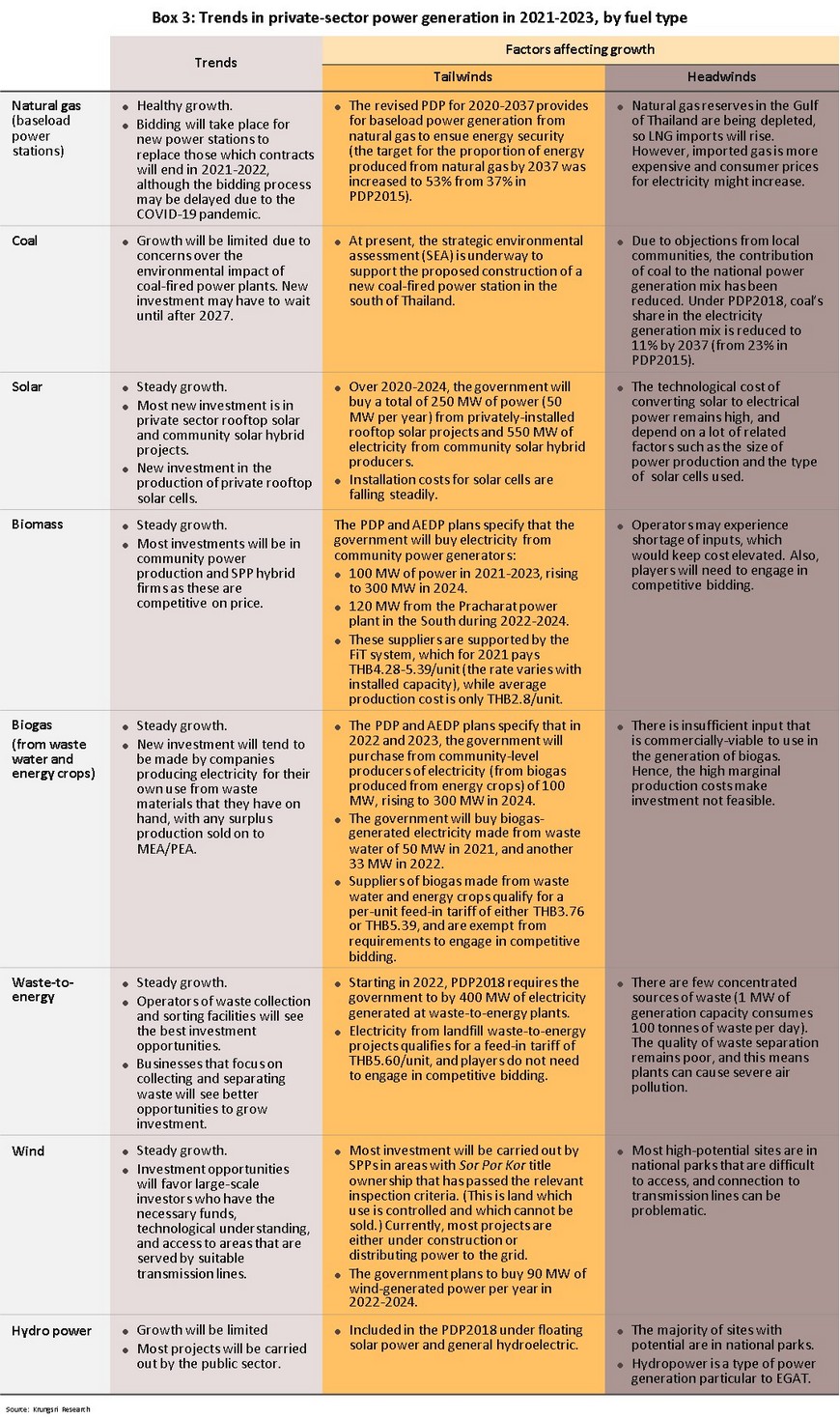 - VSPPs are expected to step up investment from 2021, especially in solar rooftop, biomass, biogas and waste-to-energy electricity projects. In line with the PDP and AEDP, the government is supporting these segments by increasing purchases of electricity from these suppliers. For biomass producers, the government plans to buy 100 MW of supply annually from community-level producers and another 60 MW annually from the Pracharat power plant in the South. For the biogas segment, the government intends to purchase 100 MW of electricity annually from community-level power plants generating electricity from energy crops. For waste-to-energy electricity projects, the government plans to buy 400 MW of electricity over 2018-2037. These players are also generally competitive in terms of access to raw materials and costs. For players active in wind power, the government plans to buy-in another 270 MW of electricity from wind farms over 2022-2024, by which time EGAT should have completed its work on the high-voltage power lines in the Northeast and South, which are required to connect commercial wind farms to the grid.