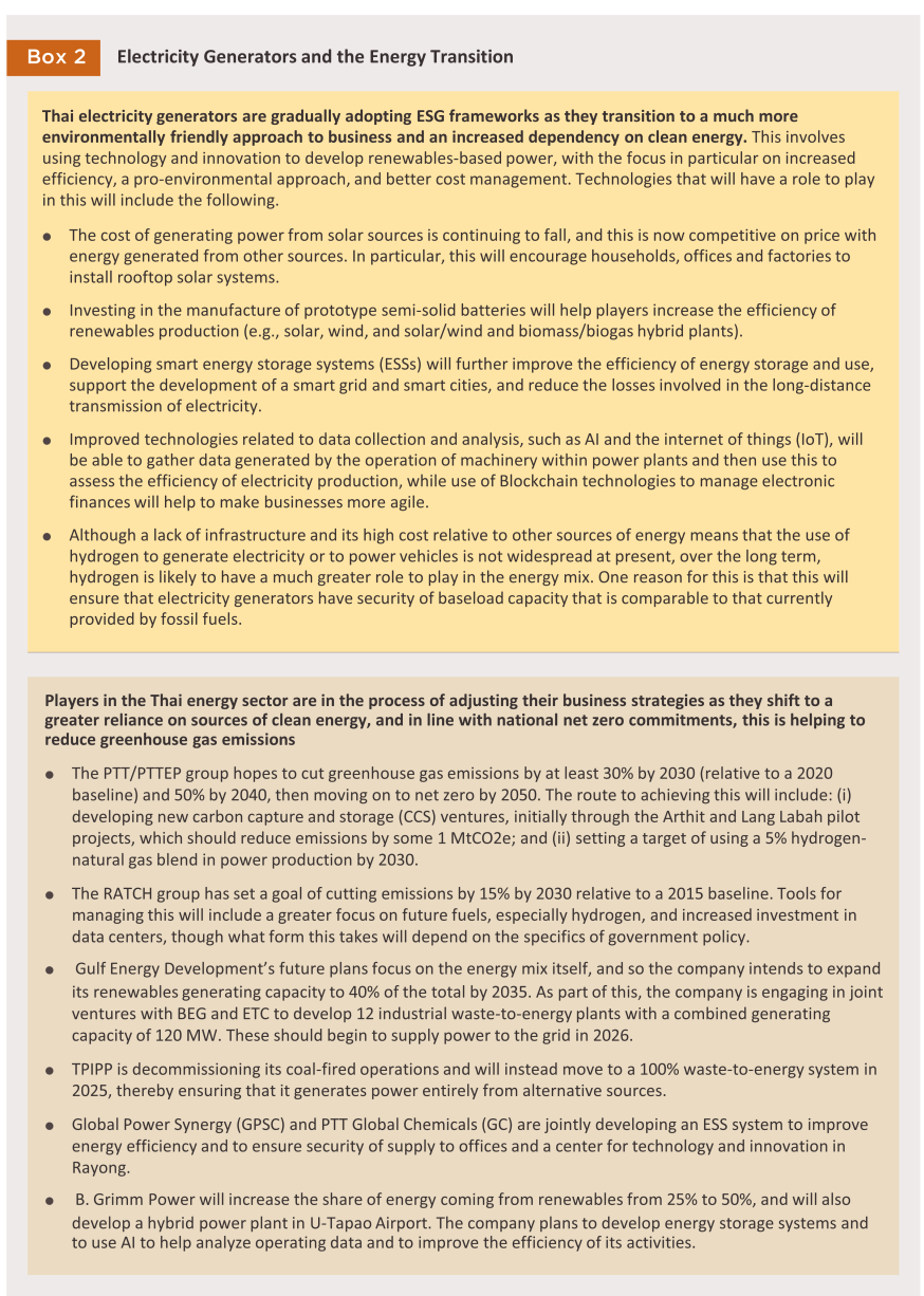 Challenges for the business include the following. (i) Increasing investment in renewables and an uptick in procurement of clean energy supplies from the private sector will add to competition across the industry. Thus, over 2021 to 2023, there was an average of 490 applications made annually for BOI investment support for projects connected to renewables (this excludes waste-to-energy schemes) and these had a value of over THB 55 billion. This compares to an average of 233 projects and a value of THB 23 billion for the period 2018-2020. (ii) Costs will trend upwards under the need to operate according to the ESG (environmental, social and governance) standards and to invest in new technologies for deployment within power stations (e.g., using natural gas and hydrogen together), and this may then put pressure on profits. (iii) The opening up of the market to a broader range of private-sector players and the use of direct PPAs to allow producers and consumers to contract directly with one another11/ may cut overall demand for electricity supplied by the grid. (iv) The long-running threats to stability in Myanmar may impact the supply of energy to Thailand, and there is a risk that this will add to domestic electricity prices.