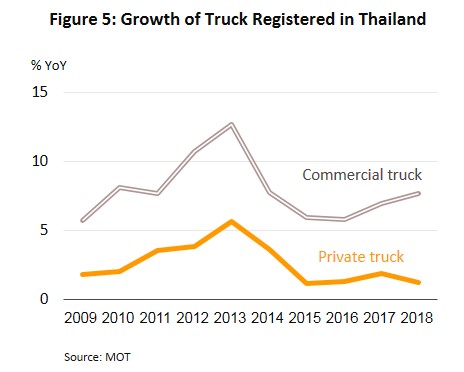There are two main categories of vehicles used in the commercial transport of goods by road. These are (i) privately owned trucks, which are used for the transport of the owner’s own goods, and (ii) trucks operated by general haulage companies that are not operating on fixed schedules (source: Department of Land Transport). As of the end of 2018, a total of approximately 1,120,000 trucks were registered in Thailand and of these, 810,000 were privately owned (i.e. 72% of the total), with the total number of trucks operated by haulage companies coming to a further 310,000 vehicles (28% of the total). Thai manufactures thus tend to rely on in-house transportation facilities when distributing goods domestically and this is because of the certainty which they have that their goods will be delivered, and also because operating in this fashion reduces the risk of being affected by a sudden inability to access transport facilities. Despite this, though, over the three years from 2016 to 2018, the number of trucks registered with hauliers grew by 6.8% per year, compared to just 1.5% annual growth for trucks registered with other types of companies (Figure 5). This then signifies a move by businesses and manufacturers to gradually switch to outsourcing these services, a move that helps companies to: (i) cut business costs, including overheads related to administration and other costs arising from vehicle repairs, insurance, and personable costs (i.e. drivers); (ii) take advantage of the specialist expertise and experience of commercial haulage operators; and (iii) reduce the overheads involved in navigating the numerous official regulations governing the transport of goods. These include rules on the permissible weight of transported goods and of trucks, the maximum size of trucks and of their loads, and the permitted speeds and travel times of goods vehicles (which may vary depending on whether the vehicle is in urban municipal area or elsewhere)[2].