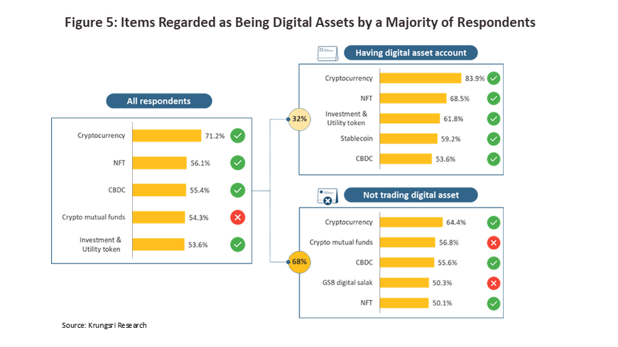 Respondents were clearly able to correctly identify cryptocurrencies, NFTs, CBDCs, and digital tokens as different types of digital assets, but they also misidentified mutual funds as an actual or potential digital asset. Even though some mutual funds do indeed invest in digital assets (e.g., in cryptocurrencies), the mutual fund itself is still not considered to be a digital asset, and a cryptocurrency-based mutual fund is not regarded as being fundamentally different from mutual funds that invest in other assets, such as bonds, equities, gold, oil, or real estate.To further investigate knowledge of digital assets, the survey respondents were split into two groups: those who held an account for trading in digital assets and those without. Among the former, almost two-thirds (64.9%) correctly answered that prize bonds4/ (the GSB digital salak) are not a type of digital asset according to the definitions given in the 2018 declaration on digital businesses. However, among those without a trading account, the proportion giving a correct answer fell to just half.