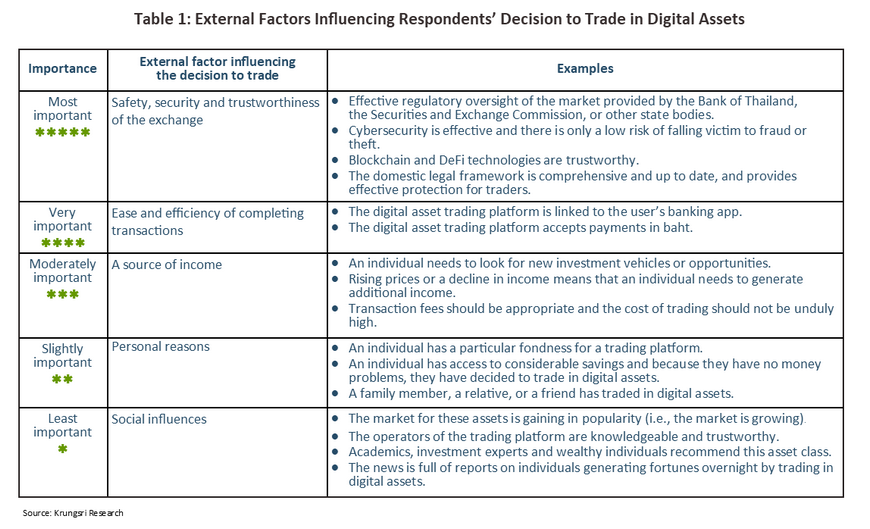 New industries such as the market for digital assets are closely tied to the finance and banking sector, and so it is not surprising that surveys conducted in Thailand and overseas reveal widespread interest among both investors and the general public in commercial banks playing a greater role in the industry. This also further illuminates the extent to which fears about cybersecurity and the trustworthiness of trading platforms continue to affect the public, but the flip side of this is that the desire to have traditional financial institutions play a role countering these problems indicates how far trust in the banking system has been maintained.