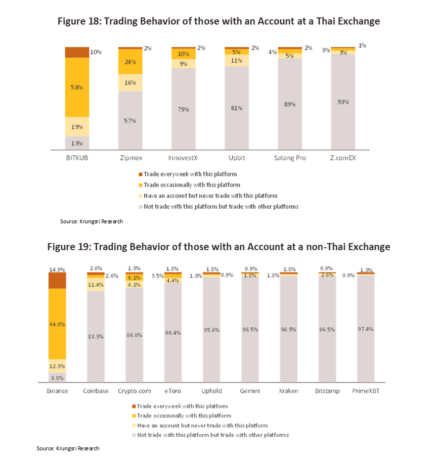 Almost 15% of respondents who reported having an overseas digital asset trading account also said that they traded cryptocurrencies on Binance at least weekly, and a further 64% traded on Binance regularly but less often than once per week. This was far ahead of the number of people trading on Coinbase or other overseas exchanges, and so it appears that among Thais, Binance is in a clear lead as the most favored non-Thai digital trading platform.