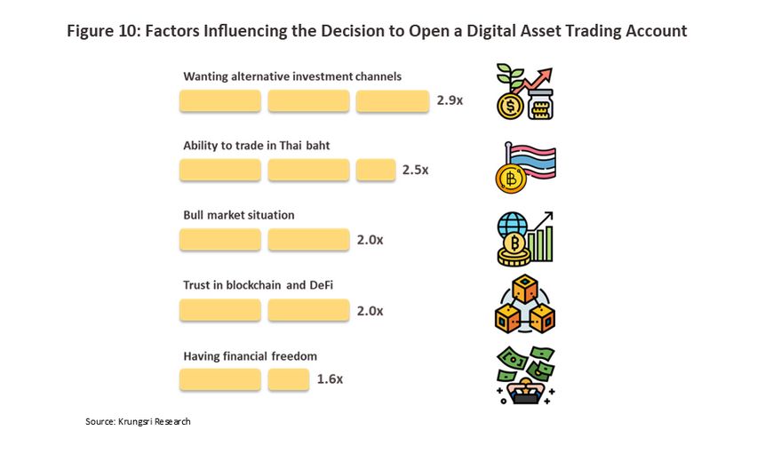 In-depth analysis shows that respondents for whom ‘looking for new investment vehicles or opportunities’ was a ‘very’ or ‘most’ important factor in determining whether or not to trade were 2.9-times more likely to open a digital asset trading account than those for whom this was not true. Similarly, respondents who valued a ‘platform’s ability to take payments in baht’ as very or most important were also 2.5-times more likely to have opened a digital asset trading account.