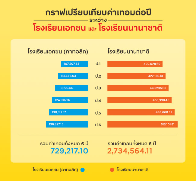 สมมติวันนี้คุณพ่อคุณแม่ อายุ 30 ปี มีลูก 1 คน อายุ 1 ขวบ ซึ่งลูกจะเข้าเรียน ป.1 เมื่อลูกอายุ 7 ปี ทั้งคู่วางแผนจะให้ลูกเรียนชั้นประถมศึกษาที่โรงเรียนเอกชน (คาทอลิก) ค่าเทอมปัจจุบันอยู่ที่ 80,000 บาท/ปี รวมค่าเทอมทั้งหมด 6 ปี ประมาณ 730,000 บาท แต่หากต้องการให้ลูกเข้าเรียนชั้นประถมที่โรงเรียนนานาชาติ ค่าเทอมปัจจุบันอยู่ที่ปีละ 300,000 บาท รวมค่าเทอมทั้งหมด 6 ปีประมาณ 2,735,000 บาท โดยกำหนดให้อัตราเงินเฟ้อสำหรับการศึกษาอยู่ที่ประมาณปีละ 5%