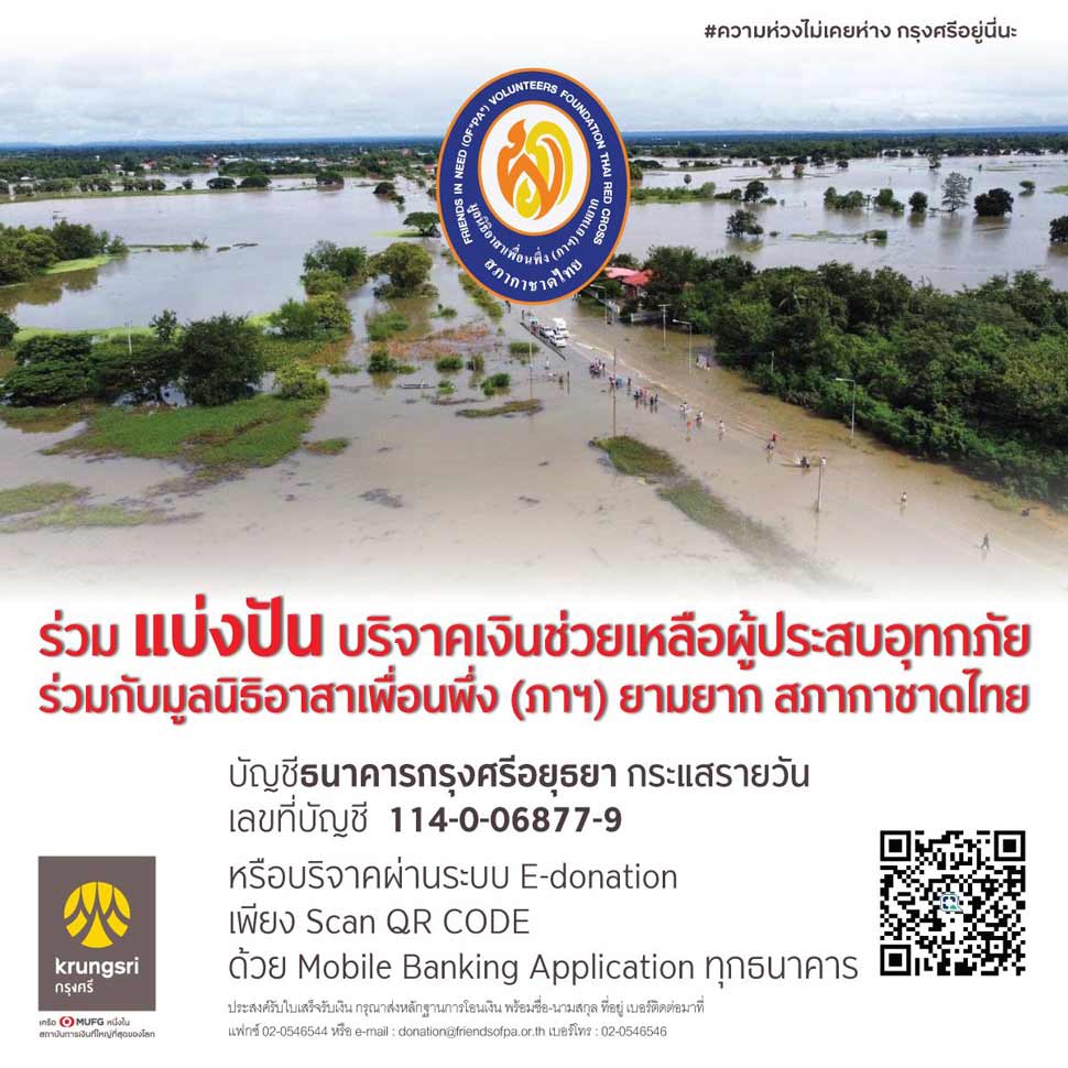 มูลนิธิอาสาเพื่อนพึ่ง (ภาฯ) ยามยาก สภากาชาดไทย ขอเชิญชวนร่วมสมทบทุนในการจัดทำถุงยังชีพฯ จัดตั้งโรงครัวฯ และฟื้นฟูพื้นที่ประสบอุทกภัย เพื่อช่วยเหลือเยียวยาผู้ประสบภัยน้ำท่วม ผ่าน