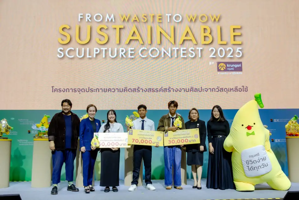 “From Waste to WOW Sustainable Sculpture Contest 2025 by Krungsri” ภายใต้แนวคิด "GO Sustainable with krungsri ไปกับน้องกล้วยกรุงศรี" เปิดพื้นที่ให้นักเรียน นักศึกษา และคนรุ่นใหม่ อายุระหว่าง 15-25 ปี ปล่อยไอเดียสร้างสรรค์ที่สะท้อนจิตสำนึกด้านสิ่งแวดล้อมผ่านผลงานศิลปะที่สร้างจากวัสดุใช้แล้ว ชิงรางวัลมูลค่ารวมกว่า 250,000 บาท ซึ่งทีมที่คว้ารางวัลชนะเลิศไปครอง คือ WE GO SUSTAINABLE จากสถาบันเทคโนโลยีพระจอมเกล้าเจ้าคุณทหารลาดกระบัง คว้าเงินรางวัล 70,000 บาท