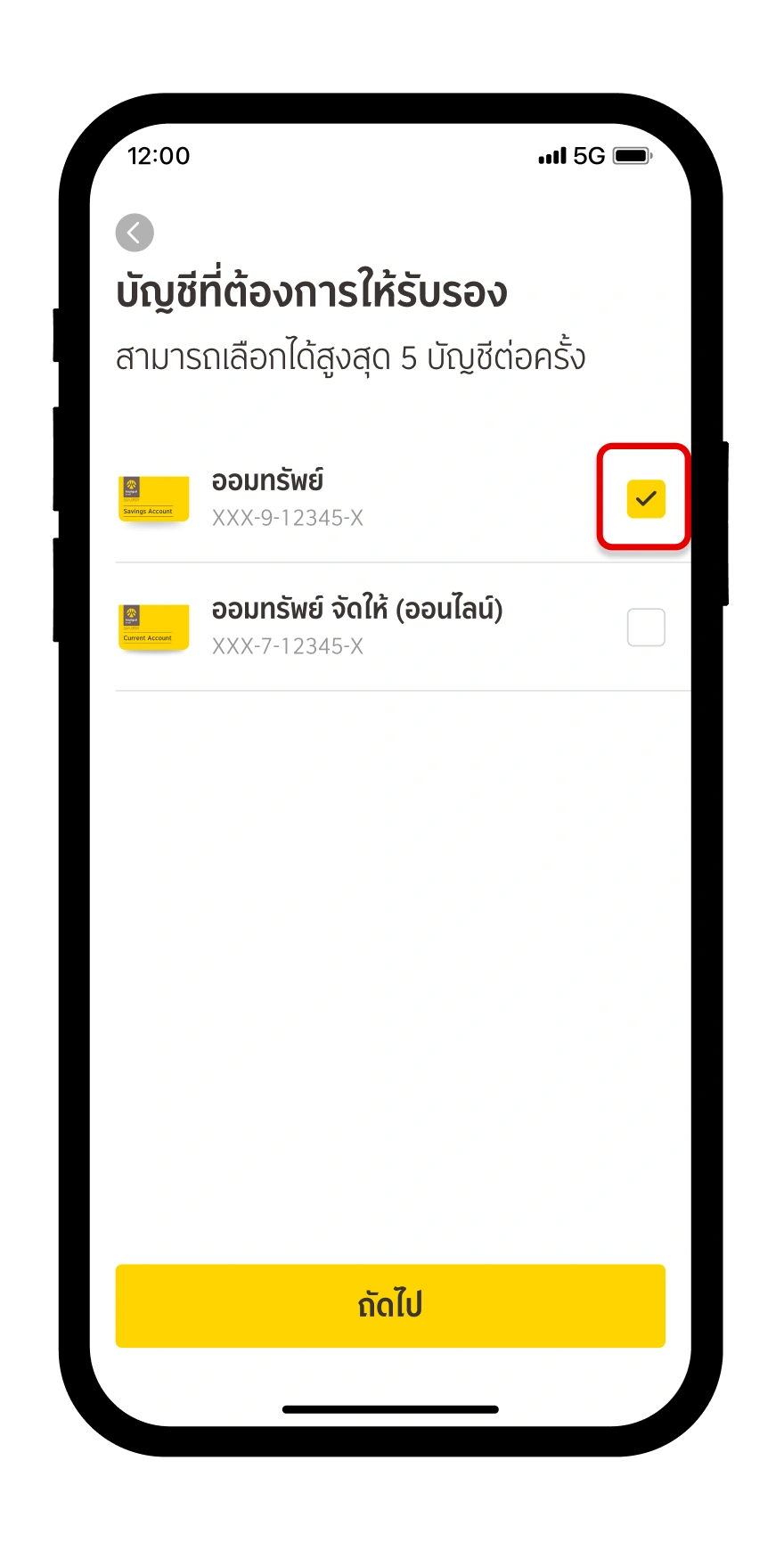 เลือกบัญชีที่คุณต้องการให้รับรองเงิน โดยคุณสามารถเลือกเฉพาะบัญชีออมทรัพย์ กระแสรายวัน และฝากประจำ ที่อยู่ในบัญชี krungsri app ของคุณ โดยเลือกได้สูงสุด 5 บัญชี