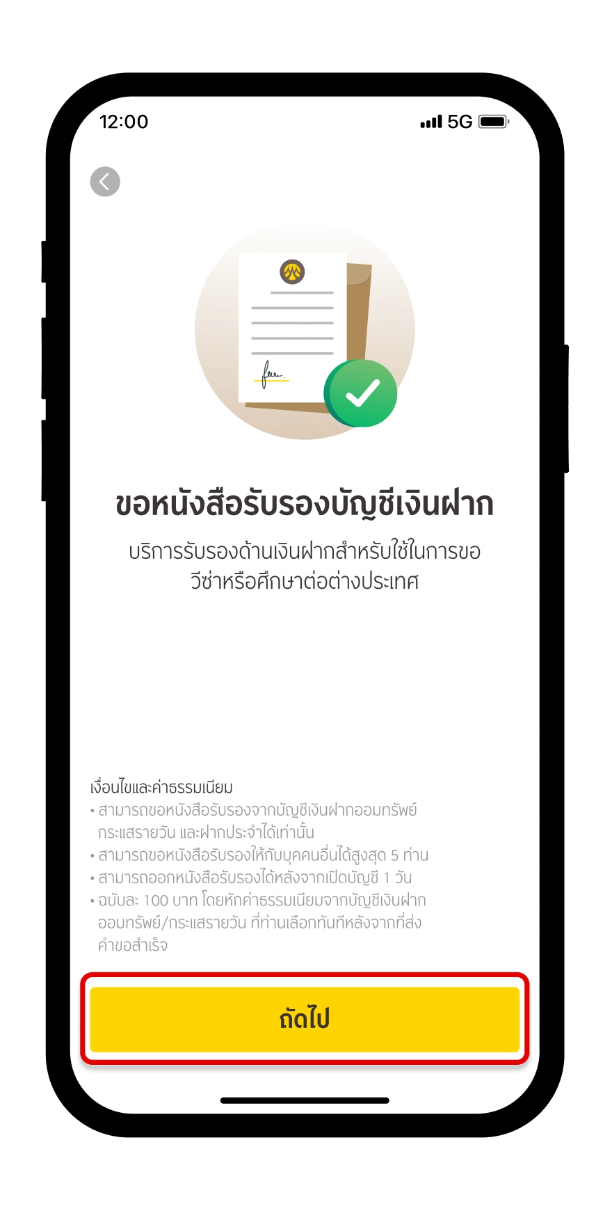 ศึกษาข้อกำหนดและเงื่อนไข พร้อมค่าธรรมเนียมการใช้บริการ แล้วกด “ถัดไป”
